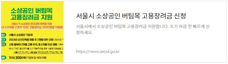 서울시에서 2023년 소상공인 버팀목 고용장려금 지원합니다. 1인당 300만 원에서 최대 10명까지 총합 3,000만 원까지 서류만 잘 준비하면 받을 수 있습니다. 많은 신청으로 조기 마감 되기 전에 빨리 신청하세요. 소상공인 버팀목 고용장려금 신청방법, 준비서류에 대하여 자세히 정리하였으니 확인하시고 서둘러 신청하세요. 신속히 찾으실 수 있도록 필요한 링크도 남겨놓겠습니다.